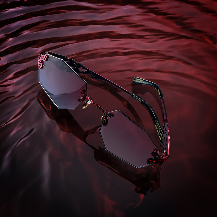 Inspired by Australia’s Great Barrier Reef, the exquisite Coral sunglasses replicate the intricate beauty of its namesake. This eye-catching design captures the best of oceanic magnificence with striking hexagonal lenses and lavish frosted gold frames, embellished with over 250 handset Swarovski crystals. It blurs the lines between sculpture and eyewear, allowing you to revel in the marvels of nature with each wear.